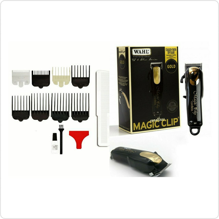 ماشین اصلاح سر و صورت وال مجیک کلیپ بیسیم بلک اند گلد Wahl Cordless Magic Clip Black and Gold از محصولات Wahl بوده که برای مصارف حرفه ای در نظر گرفته شده است .وال مجیک کلیپ دارای تیغه 2161 با دقت بالا است که سرعت و سهولت استفاده را ارائه می دهد همچنین در هر بار شارژ کردن می توان بیشتر از 90 دقیقه از آن استفاده کرد که ویژگی بسیار کاربردی ماشین اصلاح سر و صورت وال می باشد. برای راحتی استفاده کننده، Black & Gold Cordless Edition 5-Star Limited دارای کلیه لوازم جانبی مورد نیاز برای استفاده است. بسته بندی شامل (8) شانه ماشین اصلاح ، روغن ، برس تمیز کننده ، دستورالعمل ، محافظ تیغه قرمز و شارژر است.اندازه مجیک گلد 0.8 تا 3.5 میلیمتر است.ماشین اصلاح مجیک گلد نمونه ادیشن ماشین وال مجیک magic clip 8148 بوده که هردو از محصولات Wahl میباشند. این ماشین اصلاح سفارش درجه یک آسیا می باشد بدین معنی که از سری های قبلی که کیفیت بدنه و تیغه بسیار ضعیفی داشتند بسیار بهتر بوده و سنگین تر می باشند , به طوری که کاملا با نوع اروپایی این محصول قابل رقابت می باشد, البته با قیمتی بسیار مناسب تر . آداپتور این محصول با برق 220 شهری کار میکند و نیازی به مبدل برق نیست