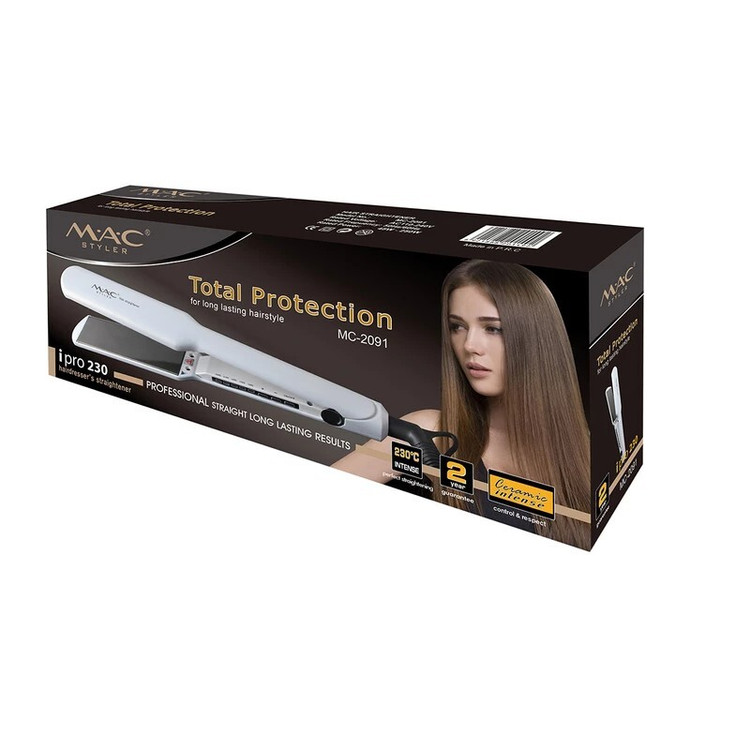اتو و حالت دهنده ی مو مک ستایلر اصلی با صفحه سرامیک نانو کروم رنگ سفید صدفی مناسب برای کراتینه تراپی دارای صفحات نانو سرامیک دارای قابلیت تنظیم دما اندازه صفحات متوسط توان قدرتی 50 وات دارای سیم گردان دارای کلید قفل مرکزی صفحه و کلید On/Off داری قفل و صفحه نمایش LED قابلیت تنظیم دما 150 تا 230 درجه سانتی گراد طول سیم یک متر و سی سانتمتر افرادی که به طور طبیعی دارای موهای مجعد یا فرفری هستند می دانند که چه حسی دارد که برای داشتن موی صاف همیشه به دنبال اتو موباشید اتوی مو یکی از سریع ترین راه ها برای داشتن موهای براق و یکدست است . بسیاری از افرادی که دارای موهای وز هستند همیشه این شکایت را دارند که صاف کردن موهایشان برایشان کاری سخت و دشوار است و به همین علت موهای خود را همیشه پشت سر گلوله کرده و جمع می کنند زیرا اگر کوتاه کنند موهایشان پف می کند و بدتر می شود و در صورت بلند بودن نیز به دنبال اتو مو می روند. استفاده از اتو مو برای صاف کردن مو کار سختی نیست و با کمی حوصله و دقت می توانید موهای خود را به صورت