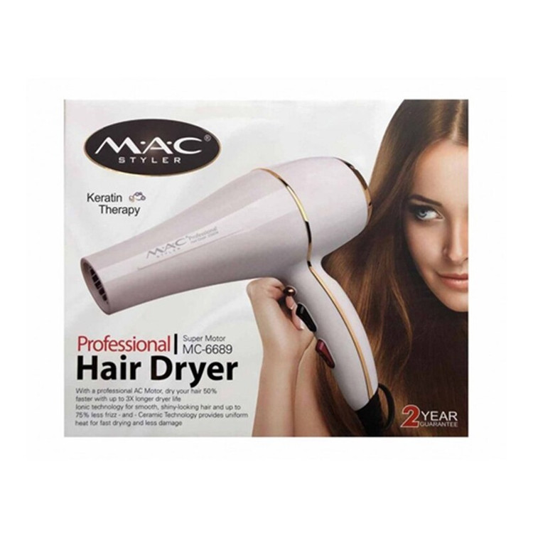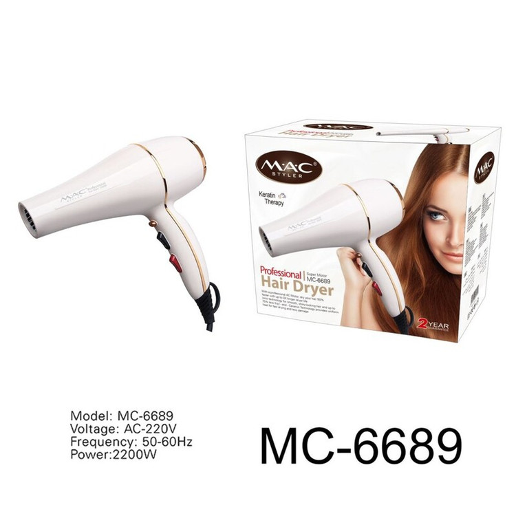 بررسی سشوار حرفه ای مک استایلر مدل MC-6689 سشوار حرفه ای مک استایلر مدل MC-6689 یکی از محصولات حالت دهنده و خشک کن مو حرفه ایی است. موتور قدرتمند و AC این سشوار با توان مصرفی 2200 وات بسیار مناسب برای کراتینه تراپی است. همچنین این دستگاه مجهز به سیستم تولید یون است. این سیستم با فعال کردن یون مولکول هوا مانع از وز کردن موها می شود. همچنین باعث شادابی و درخشندگی موها می شود. با استفاده از ویژگی دکمه کول شات امکان تولید باد سرد امکان پذیر است. این دستگاه دارای 3 حالت مختلف کنترل تولید باد در درجه های خاموش – متوسط و زیاد است. همچنین دارای قابلیت کنترل حرارت باد خروجی نیز است. حالت های حرارت باد خروجی شامل باد سرد – ملایم و گرم است. جنس بدنه سشوار مک استایلر مدل66890 از متالیک فایبر گلاس بوده که طراحی زیبایی نیز دارد. ویژگی های برجسته سشوار متور سیم پیچی مسی سایز متور 21 پرتاب باد چهار حالته متور در دو دور متور المنت های سرامیکی بدنه ضد خط خش کابل 2متر نیم